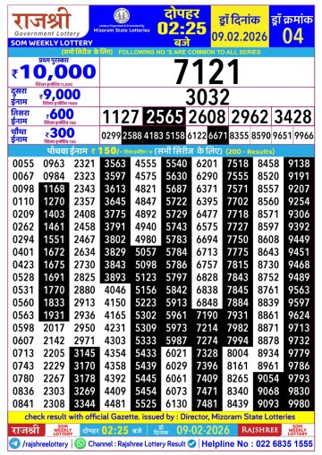 Rajshree Lottery Result Today 4 PM – 09 February 2026