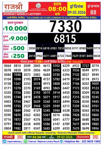 Rajshree Lottery Result Today 2.25 PM – 09 February 2026