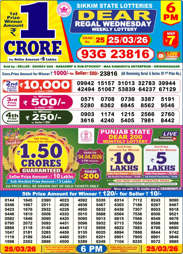 - Dear Lottery Result Today 6 PM Dated 25 March 2026 - Published
