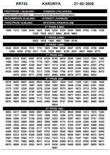 Kerala Lottery Result Today KR-743 Karunya 21 February 2026
