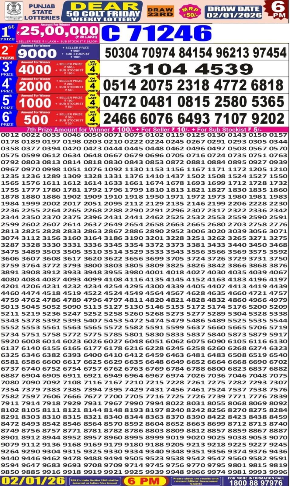 Punjab State Dear 50 Lottery 06.00 PM 02.01.2026