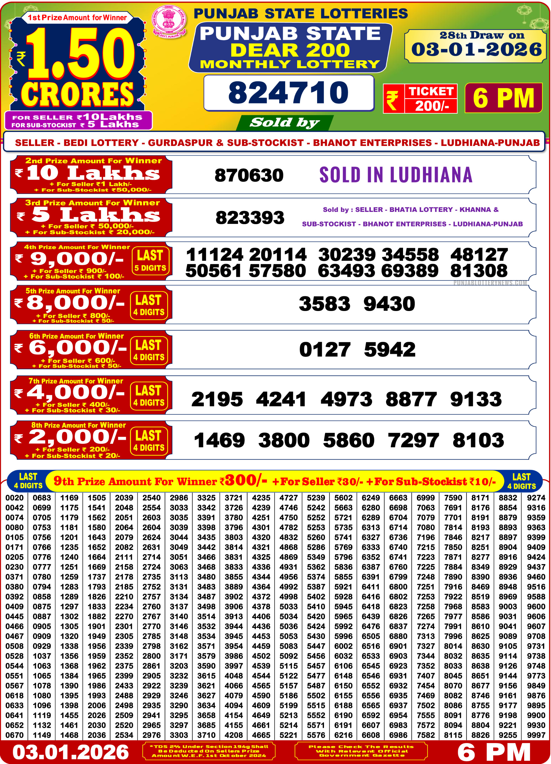 Punjab State Dear 200 Monthly Result 03.01.2026