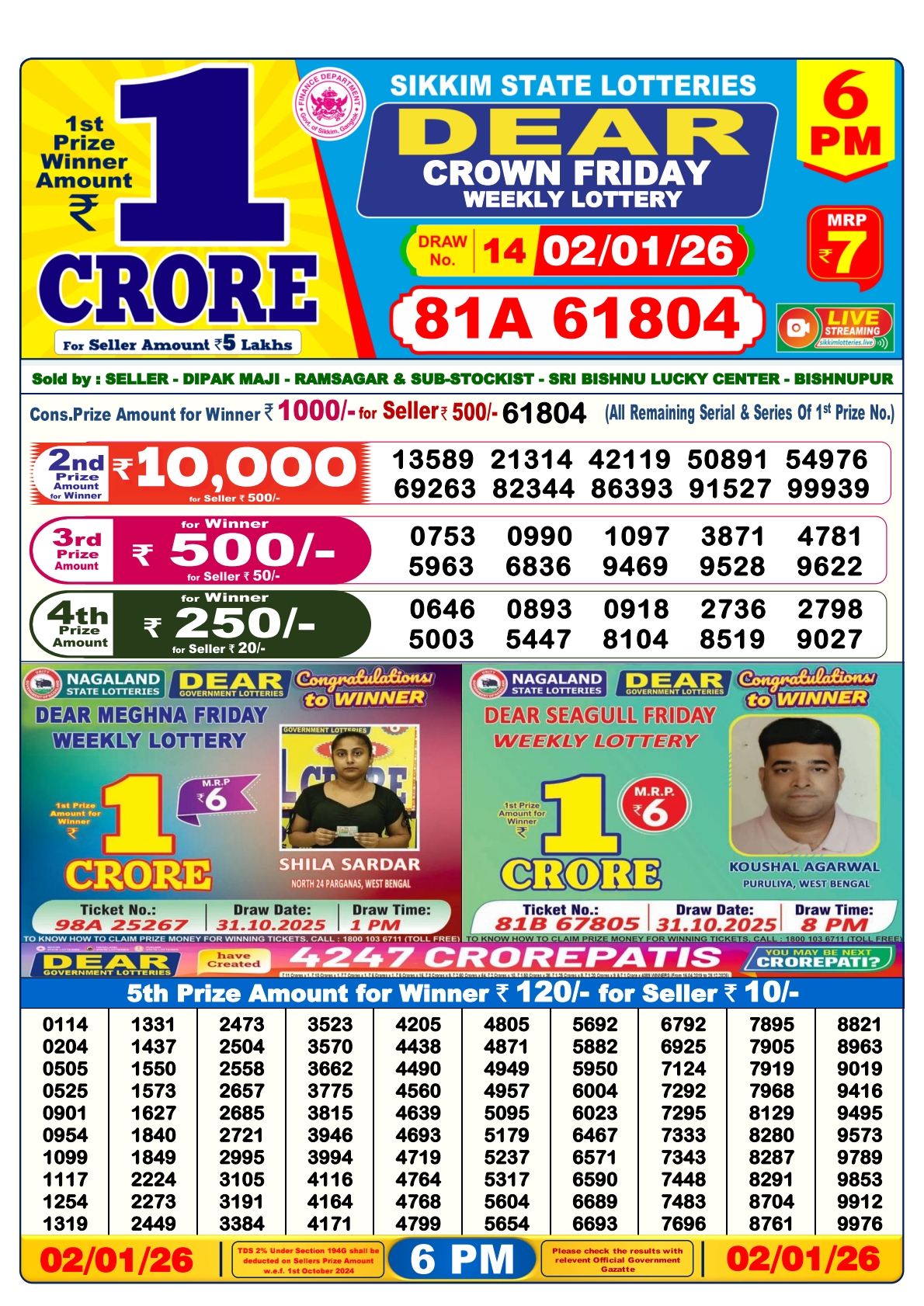 Dear Lottery 6 PM Result Declared 02.01.2026