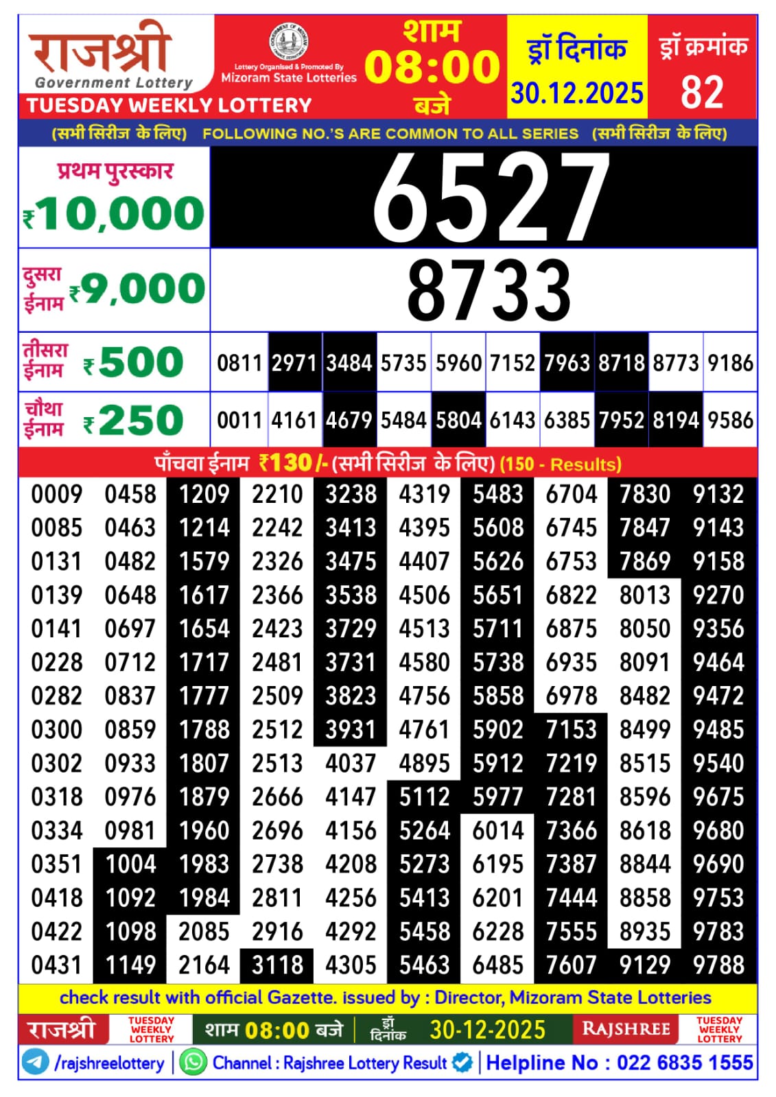 Rajshree  Weekly Lottery 8 PM Result 30.12.2025