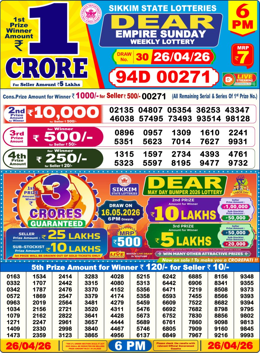 Today's Result is Dear Empire Weekly Lottery Result 6 PM 26/04/26