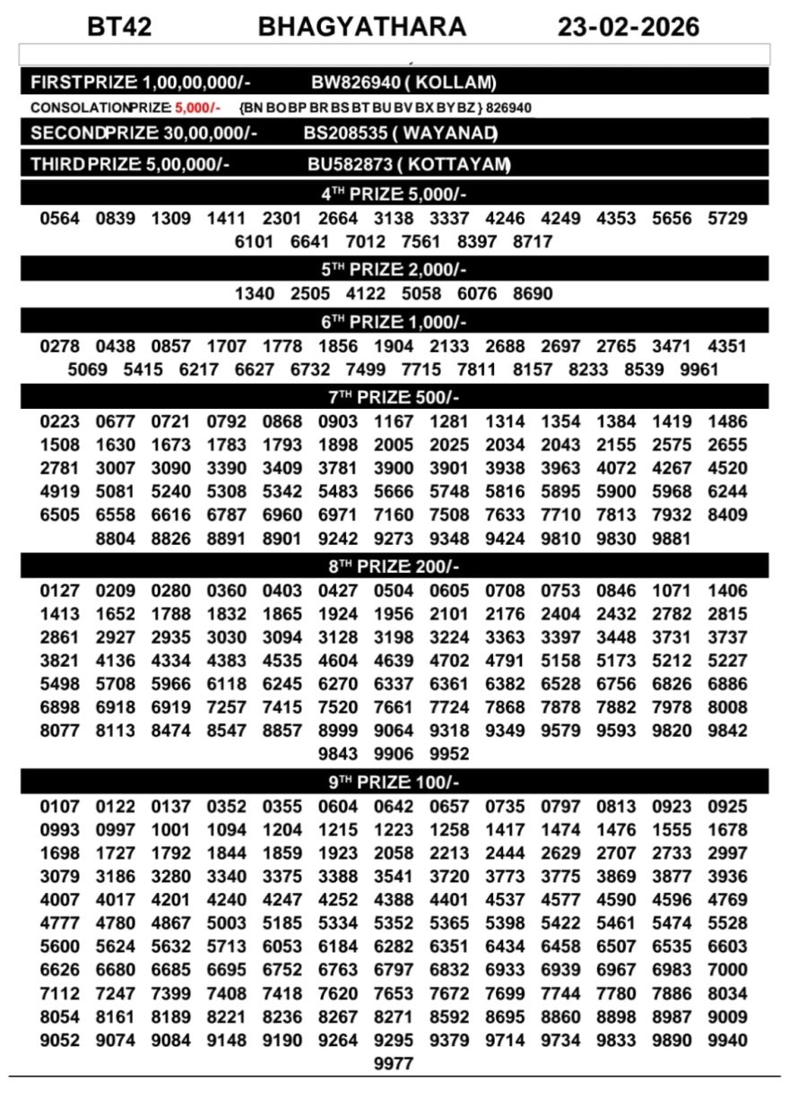 Kerala Lottery Result Today BT-42 Bhagyathara 23 February 2026 Leave a Comment on Kerala Lottery Result Today BT-42 Bhagyathara 23 February 2026 Posted in Kerala Lottery Result Previous Results SM33 Lottery Result Kerala State Samrudhi Kerala Lottery Result Today KN-611 Karunya 19 February 2026 KN602 Lottery Result Kerala State Karunya Plus Kerala Lottery Result Today KR -739 Karunya 17 january 2026 Author: Results Editorial Team