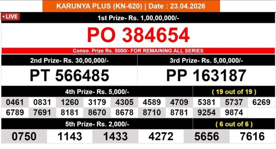 Kerala Lottery Result Today KN-619 Karunya Plus 23 April 2026 Leave a Comment on Kerala Lottery Result Today KN-619 Karunya Plus 23 April 2026 Posted in Kerala Lottery Result Previous Results Kerala Lottery Result Today BT-44 Bhagyathara 09 March 2026 Kerala Lottery Result Today DL-35 Dhanalakshmi 14 january 2026 Kerala Lottery Result Today KN-611 Karunya 19 February 2026 Kerala Lottery Result Today SM-43 Samrudhi 22 February 2026 Author: Results Editorial Team