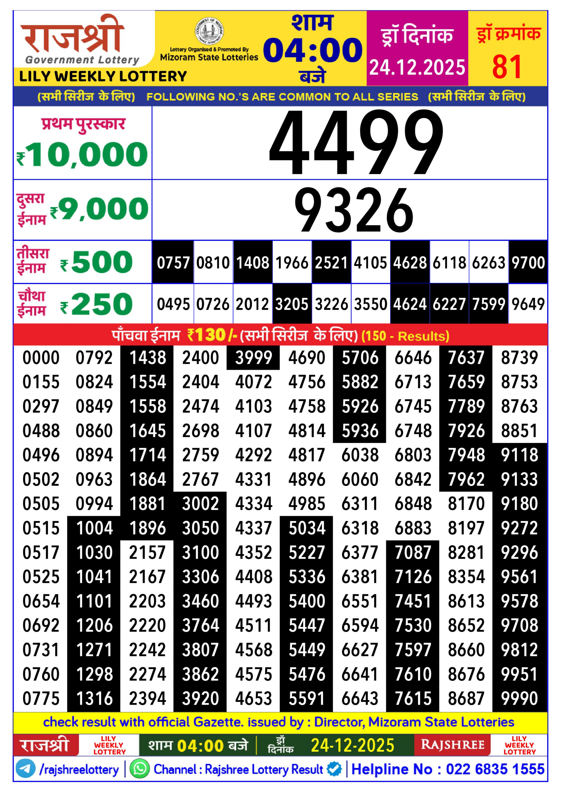 Labh Laxmi Lottery Result Today 15.12.2025 4PM Leave a Comment on Labh Laxmi Lottery Result Today 15.12.2025 4PM Posted in Results Previous Results Rajshree Weekly Lottery 08.00PM 17.11.2025 Rajshree 80 Monthly lottery Result 11.12.2025 Live Now Rajshree Lottery 4 PM Result Declared 24.12.2025 Rajshree Lottery 1 PM Result Declared 04.01.2026 Author: Results Editorial Team