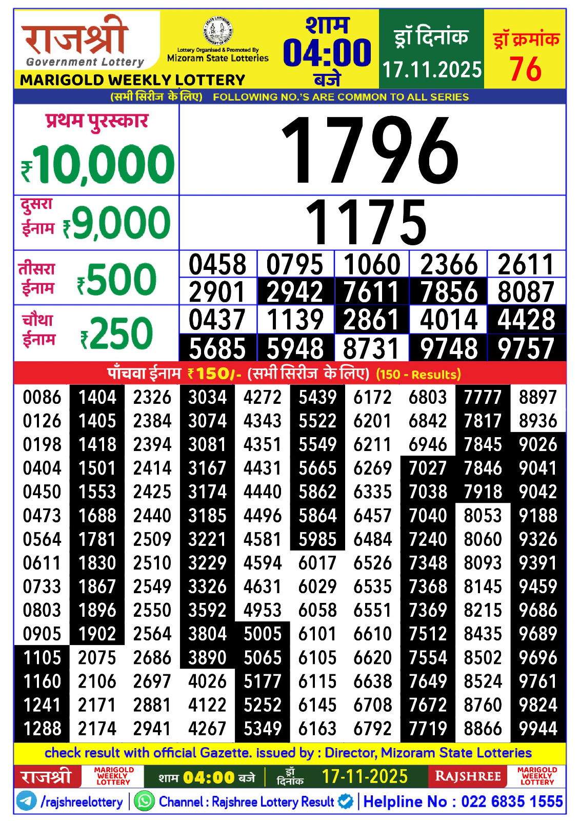 Rajshree Lottery 4 PM Result Declared 17.11.2025