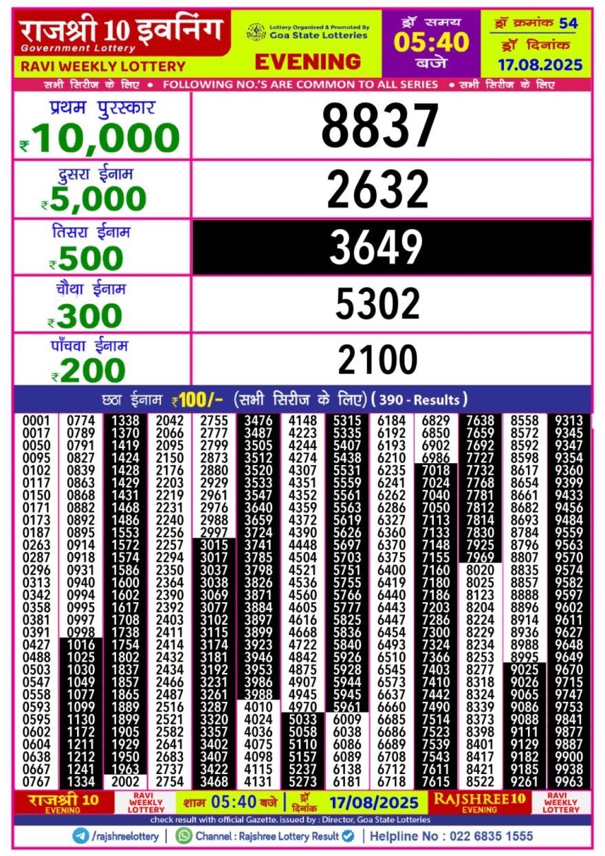 Rajshree 10 Lottery 5:40 PM Result Declared 17.08.2025 Leave a Comment on Rajshree 10 Lottery 5:40 PM Result Declared 17.08.2025