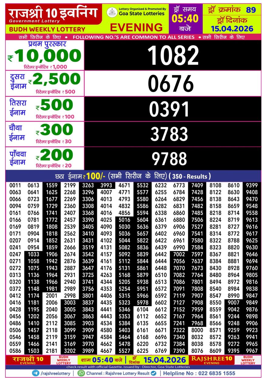 Today's Result is RAJSHREE 10 EVENING SHANI WEEKLY LOTTERY 5:40 PM 15/04/26