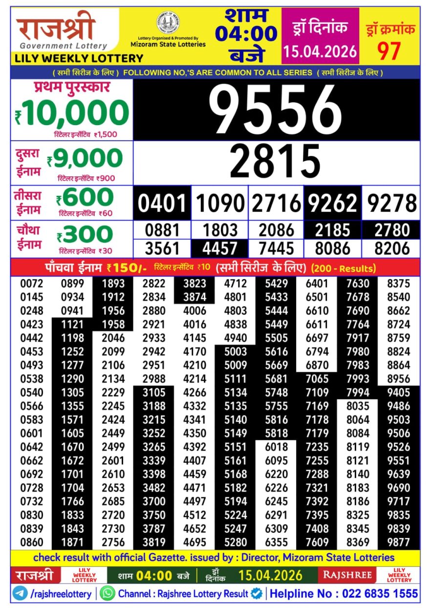 Today's Result is RAJSHREE ORCHID WEEKLY LOTTERY 4 PM 15/04/26