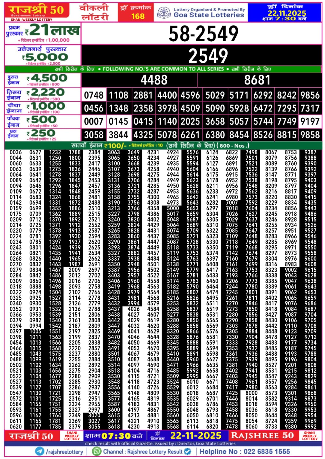 Rajshree Weekly Lottery 08.00PM 23.11.2025 Leave a Comment on Rajshree Weekly Lottery 08.00PM 23.11.2025 Posted in Results Previous Results Dear Lottery 6 PM Result Declared 26.11.2025 Dear Lottery 6 PM Result Declared 24.11.2025 Rajshree 50 Weekly Lottery 07.30PM 22.11.2025 Rajshree Lottery 1 PM Result Declared 14.12.2025 Author: Results Editorial Team