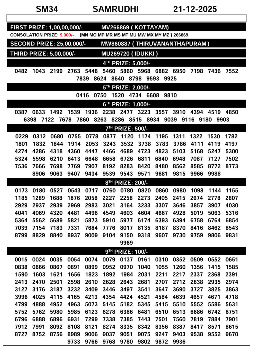 SM34 Lottery Result Kerala State Samrudhi Leave a Comment on SM34 Lottery Result Kerala State Samrudhi